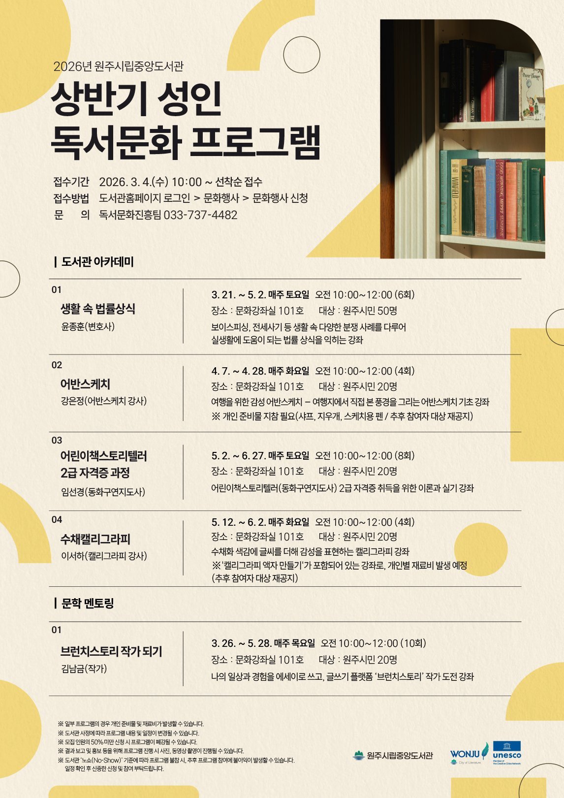 원주시립중앙도서관, 상반기 성인 독서문화 프로그램 운영 (원주시 제공) [PEDIEN] 원주시립중앙도서관이 시민들의 지적 욕구를 충족시키고 풍요로운 여가 생활을 지원하기 위해 2026년 상반기 성인 독서문화 프로그램을 운영한다.이번 프로그램은 도서관 아카데미, 문학 멘토링, 수요인문학 강좌로 구성되어 있으며, 3월 4일부터 도서관 홈페이지를 통해 선착순으로 접수를 받는다.도서관 아카데미에서는 변호사와 함께하는 '생활 속 법률상식' 강좌를 통해 일상생활에 유용한 법률 정보를 제공하고, '어반스케치' 및 '수채캘리그라피' 강좌를 통해 시민들의 예술적 감수성을 함양할 계획이다.또한, '어린이책스토리텔러 2급' 자격증 취득 과정도 운영하여 전문적인 역량 개발을 돕는다.문학 멘토링 프로그램에서는 '출근하기 싫은 날엔 카프카를 읽는다'의 김남금 작가와 함께 자신의 일상을 에세이로 작성하고, 브런치 스토리 작가에 도전하는 기회를 제공한다.수요인문학 강좌는 4월부터 6월까지 매달 새로운 주제로 진행된다. 4월에는 인공지능, 5월에는 차, 6월에는 여행을 주제로 다양한 인문학적 지식을 쌓을 수 있도록 구성했다.각 프로그램은 해당 월의 첫째 주 수요일 오전 10시부터 도서관 홈페이지를 통해 선착순으로 신청할 수 있다.이훈주 도서관장은 "책을 매개로 시민들이 서로 소통하고 성장할 수 있는 다양한 문화 프로그램을 준비했다"라며, 시민들의 많은 관심과 참여를 당부했다. -