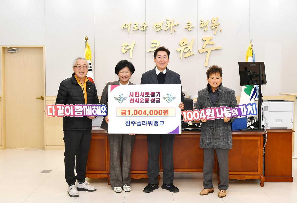 원주플라워뱅크, 시민서로돕기 천사운동 후원금 기탁 (원주시 제공) [PEDIEN] 원주플라워뱅크가 시민들의 사랑에 보답하고자 천사운동에 후원금을 기탁하며 따뜻한 나눔을 실천했다.지난 23일, 원주시청에서 열린 전달식에는 원강수 시장과 최원선 원주플라워뱅크 대표, 박만호 천사운동본부장, 이상혁 천사지킴이 연합회장이 참석하여 훈훈한 분위기를 연출했다.원주플라워뱅크는 이날 시민서로돕기 천사운동본부에 100만 4000원의 후원금을 전달했다. 이 후원금은 천사운동본부를 통해 저소득층 328세대의 생계비 지원과 '아이 좋은 원주' 천사 사업에 사용될 예정이다.최원선 대표는 “원주시민들에게 받은 사랑에 보답하고자 후원을 결정했다”며, “앞으로도 지속적인 나눔 활동을 통해 지역사회에 기여하겠다”고 밝혔다.원강수 시장은 “어려운 이웃을 위한 천사운동에 동참해 주셔서 감사드린다”며, “원주시민 모두가 행복한 도시를 만들기 위해 최선을 다하겠다”고 화답했다.원주플라워뱅크의 이번 후원은 지역사회 나눔 문화 확산에 기여하며, 기업의 사회적 책임을 다하는 모범적인 사례로 평가받고 있다. -