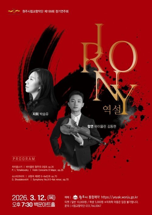 원주시립교향악단, 제199회 정기연주회 'IRONY 역설'개최 (원주시 제공) [PEDIEN] 원주시립교향악단이 다음 달 12일 백운아트홀에서 제199회 정기연주회 'IRONY 역설'을 개최한다.이번 공연에서는 박승유 지휘자가 이끄는 가운데 바이올리니스트 김동현이 협연하여 차이콥스키 바이올린 협주곡과 쇼스타코비치 교향곡 제9번을 선보일 예정이다.차이콥스키 바이올린 협주곡은 작곡가가 창작의 어려움을 겪던 시기에 탄생한 곡으로, 바이올린의 아름다운 선율과 극적인 변화가 특징이다. 김동현은 깊이 있는 음색으로 곡을 해석하여 관객에게 감동을 선사할 것으로 기대된다.쇼스타코비치 교향곡 제9번은 제2차 세계대전 종전이라는 시대적 배경과는 대조적으로 밝고 경쾌한 분위기를 자아낸다. 곡 전체에 흐르는 긴장감과 유머는 음악적인 아이러니를 느끼게 하며, 쇼스타코비치의 창의성을 엿볼 수 있게 한다.특히 이번 공연은 국립심포니오케스트라와 부천 필하모닉 오케스트라 등에서 활발하게 활동 중인 박승유 지휘자와 바이올리니스트 김동현의 협연으로 더욱 기대를 모은다. 두 연주자가 각기 다른 매력을 가진 두 곡을 어떻게 조화롭게 풀어낼지 주목할 만하다.예매는 원주시 통합예약플랫폼에서 가능하며, 자세한 정보는 원주시립교향악단에 문의하면 된다. -
