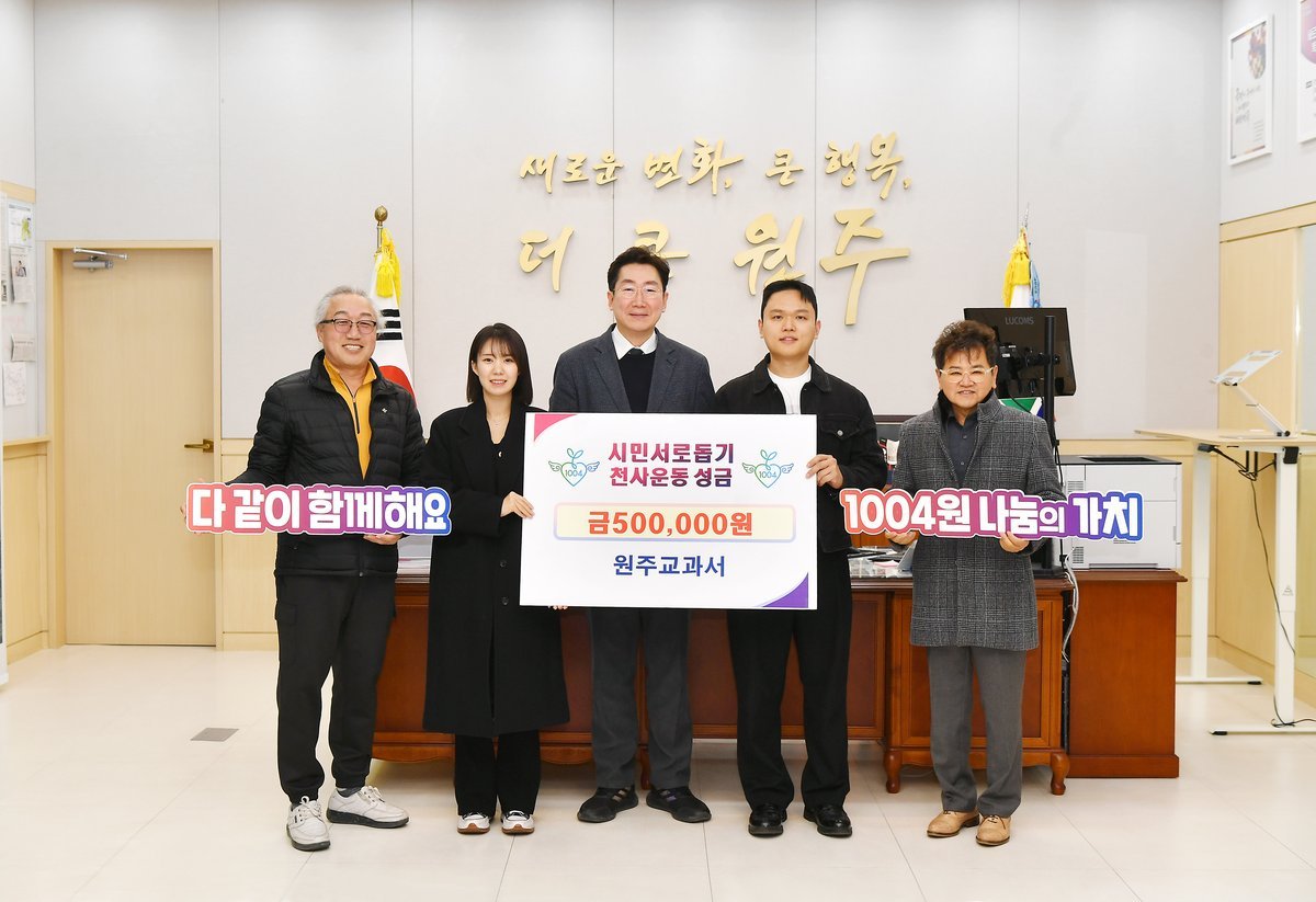 원주교과서 시민서로돕기 천사운동 후원금 기탁 (원주시 제공) [PEDIEN] 원주교과서는 지난 23일 원주시청에서 천사운동 후원금 50만원을 기탁했다.전달식에는 원강수 시장을 비롯해 원주교과서 김기봉 대표, 한희진 작가와 박만호 천사운동본부장, 이상혁 천사지킴이 연합회장 등이 참석했다.시민서로돕기 천사운동은 어려운 이웃을 돕기 위한 원주 지역 기반의 나눔 운동이다.후원금은 천사운동본부를 통해 저소득층 328세대에 월 18만원씩 생계비로 지원되며 아이 좋은 원주 천사 사업비로도 쓰인다.김기봉 대표는 “원주교과서는 지역사회와 상생하는 동시에 어려운 이웃에게 희망과 온정을 전하고자 이번 후원금 기탁을 결정했다”며 “앞으로도 따뜻한 나눔 활동에 지속적으로 참여하겠다”고 전했다.원강수 시장은 “천사후원금을 기부해 주셔서 감사드린다”며 “시민 모두가 행복한 도시가 되도록 최선을 다하겠다”고 말했다.