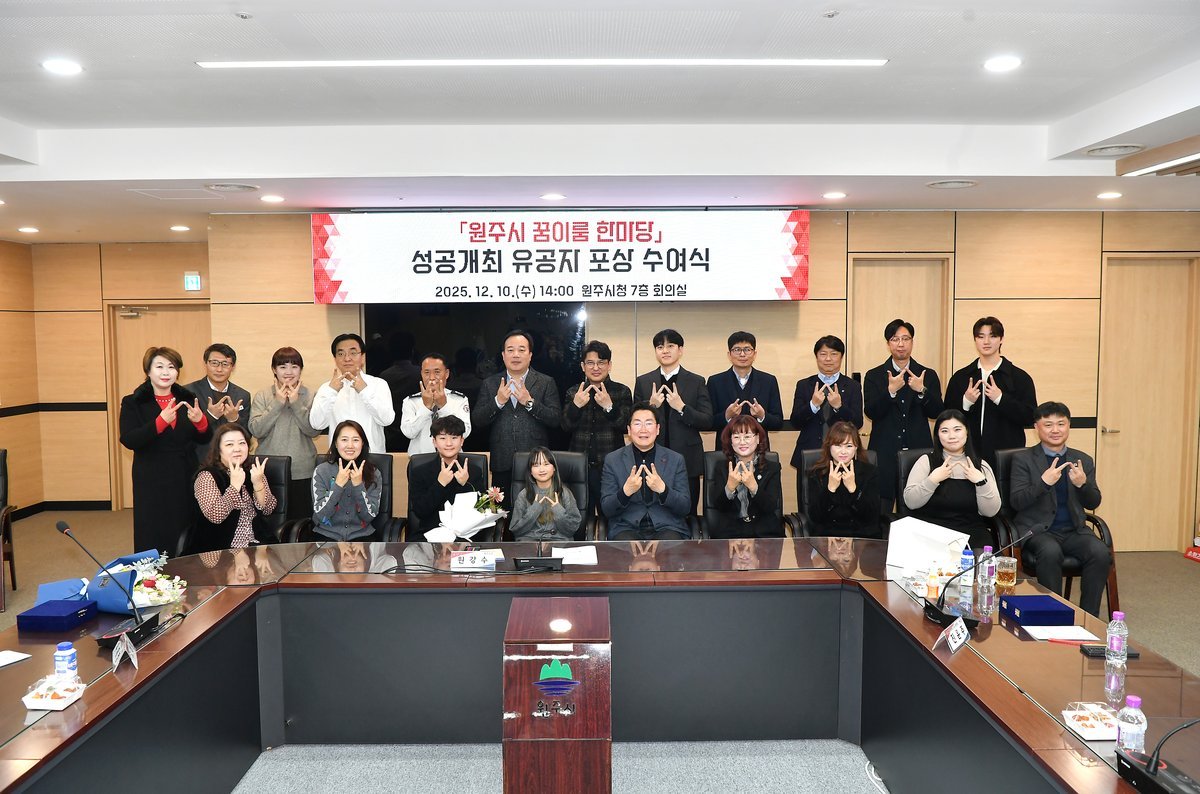 원주시, ‘꿈이룸 한마당’숨은 주역들에 표창 수여...헌신에 감사 전해 (원주시 제공) [PEDIEN] 원주시는 지난 10일 시청에서 ‘원주시 꿈이룸 한마당 성공개최 유공자 포상 수여식’을 개최하고, 안전하고 즐거운 축제를 만들기 위해 힘쓴 유공자들에게 감사를 전했다.이번 수여식은 작년 가을부터 시작해 총 3회 개최된 ‘원주시 꿈이룸 한마당’행사 현장에서 투철한 봉사 정신으로 행사를 빛낸 민간인과 관계자 23명의 노고를 격려하기 위해 마련됐다.○ 자율방범연합대부터 교육 관계자·공공기관까지…지역사회 협력 빛나이날 포상은 화려한 무대 뒤에서 묵묵히 소임을 다한 이들에게 돌아갔다.수상자들은 인파 속에서도 단 한 건의 안전사고 없이 행사가 마무리될 수 있도록 현장을 지킨 숨은 공로자들이다.포상 대상은 △행사장 주차 및 안전 관리를 책임진 ‘원주시자율방범연합대’△행사 기획과 공연, 진행 전반에 도움을 준 ‘원주시 학원연합회’와 ‘평생교육인 e마음봉사단’△다양한 무대공연을 펼친 ‘꿈이룸 바우처 가맹점들’△체험프로그램 운영 등에 힘쓴 ‘관내 대학 및 공공기관 관계자들’이다.○ 아이들의 웃음소리 지키는 ‘지역 교육 공동체’가치 확인이번 행사가 아이들의 웃음소리로 가득 찰 수 있었던 배경에는 이들의 헌신적인 협력이 있었다.교통 통제부터 현장 안전 관리, 프로그램 운영에 이르기까지 각자의 자리에서 보여준 열정이 축제를 더욱 따뜻하게 만들었다.원강수 원주시장은 “현장을 든든히 지켜주신 여러분의 보이지 않는 땀방울 덕분에 행사가 빛날 수 있었다”라며, “원주의 미래인 아이들을 위해 함께 애써주신 헌신에 깊은 존경과 감사를 표한다”라고 말했다.