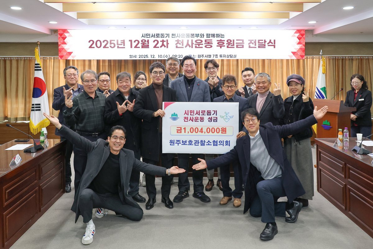원주보호관찰소협의회, 시민서로돕기 천사운동 후원금 기탁 (원주시 제공) [PEDIEN] 원주보호관찰소협의회가 원주시의 시민서로돕기 천사운동에 후원금 100만 4000원을 기탁하며 따뜻한 나눔을 실천했다.지난 10일 원주시청에서 열린 전달식에는 원강수 원주시장, 조용석 원주보호관찰소협의회장, 김학배·서인석·성유라 부회장, 춘천보호관찰소 원주지소 관계자, 박만호 시민서로돕기 천사운동본부장 등이 참석했다.시민서로돕기 천사운동은 원주시의 대표적인 나눔 운동으로, 어려운 이웃을 돕기 위해 추진되고 있다.이번에 기탁된 후원금은 천사운동본부를 통해 차상위계층 340세대에 매월 18만 원씩 생계비로 지원될 예정이다. 또한, '아이 좋은 원주' 천사 사업에도 사용될 계획이다.조용석 회장은 “천사운동을 통해 이웃사랑을 실천할 수 있어 기쁘다”며, 앞으로도 원주보호관찰소협의회의 활동을 통해 지역사회 복지 발전에 꾸준히 기여하겠다는 뜻을 밝혔다.원강수 시장은 천사운동에 동참해 준 원주보호관찰소협의회에 감사를 표하며, 시민 모두가 행복한 원주를 만들기 위해 최선을 다하겠다고 말했다. -