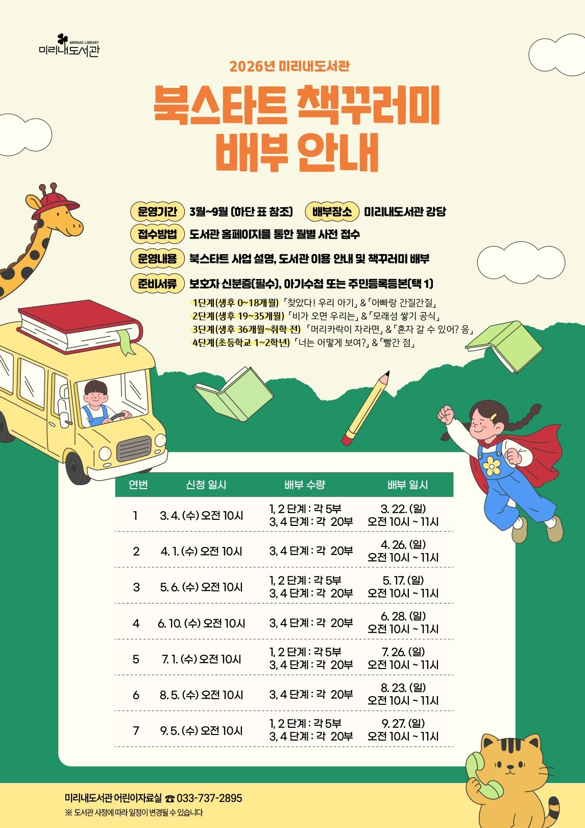 미리내도서관, 북스타트 책꾸러미 배부 (원주시 제공) [PEDIEN] 원주시 미리내도서관은 오는 3월부터 영유아와 어린이를 대상으로 ‘2026년 북스타트 책꾸러미 배부사업’을 운영한다.북스타트는 영유아가 일상에서 자연스럽게 책을 접할 수 있도록 지원하는 독서문화 사업으로 아이들에게 성장 단계에 맞는 도서를 제공해 가정 내 독서 활동을 돕기 위해 마련됐다.책꾸러미는 생후 0개월부터 초등 2학년까지 연령별 총 4단계로 나눠 배부한다.각 꾸러미는 연령에 적합한 그림책 2권과 안내 책자 등으로 구성된다.신청은 도서관 누리집을 통한 월별 사전 접수 방식으로 운영된다.접수 후 지정된 날짜에 도서관을 방문하면 책꾸러미를 수령할 수 있다.또한 꾸러미 수령과 함께 북스타트 사업 소개와 도서관 이용 방법 안내도 진행될 예정이다. -