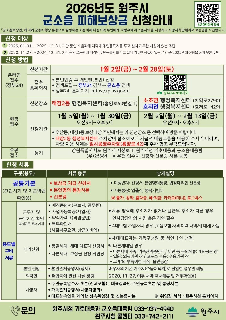 원주시, 2026년 군소음 피해보상금 신청 접수…온라인·현장 접수 진행
