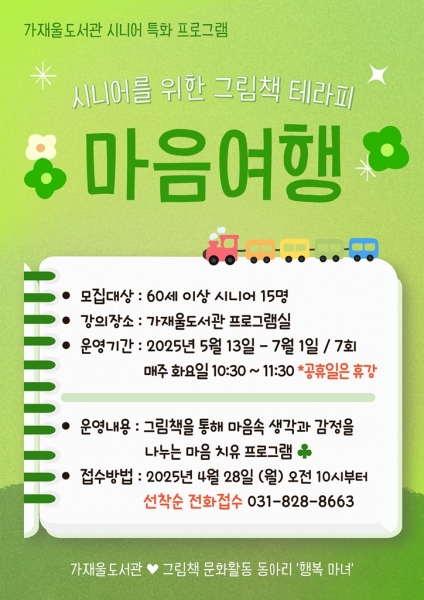 [PEDIEN] 의정부가재울도서관은 60세 이상 시니어를 위한 그림책 테라피 프로그램 ‘마음 여행’을 운영한다.