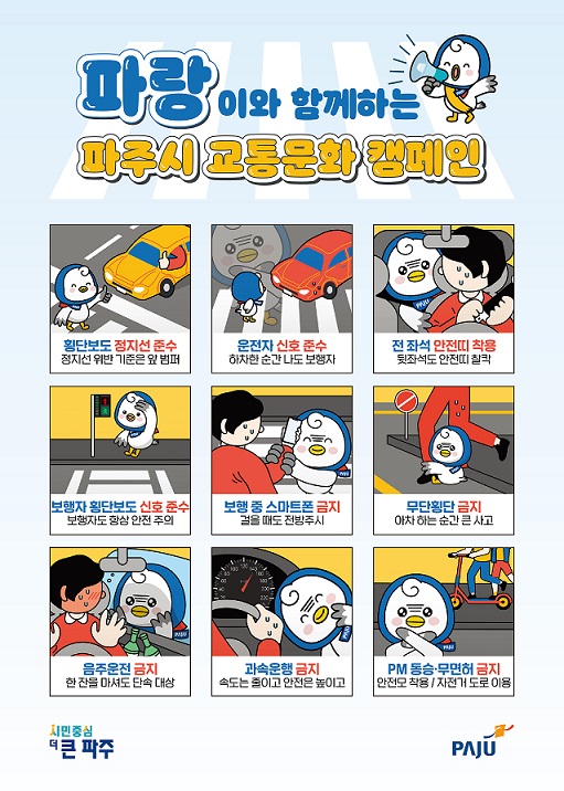 파주시는 2023년부터 매년 교통안전 종합대책을 마련해 다양한 교통안전 사업을 추진해 왔으며 그 결과 2023년 교통문화지수 평가에서 ‘A등급’을 획득, 전국 30만 이상 시군 그룹 중 3위를 달성하는 성과를 거뒀다.