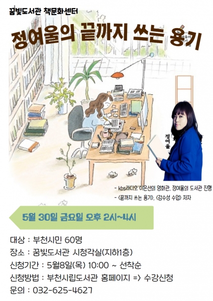 [PEDIEN] 부천시립꿈빛도서관은 2025년 상반기 책문화센터 저자강연으로 5월 30일 오후 2시 정여울 작가를 초청해 ‘끝까지 쓰는 용기’를 주제로 강연을 진행한다.