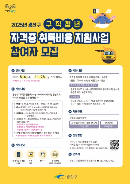 이번 사업은 광산구에 주소를 두고 거주하고 있는 19세∼39세까지 미취업 청년들을 대상으로 자격증 취득에 필요한 시험 응시료, 수강료를 1인당 연 1회 최대 10만원까지 지원한다.