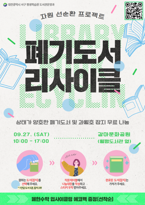 이번 행사는 ‘서구 책 축제’ 와 함께 진행되며 2,700여 권의 도서와 과월호 잡지 25종이 제공된다.