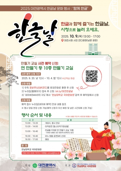 특히 만들기 체험 교실은 사전 예약과 현장 접수를 병행해 운영되며 사전 예약은 9월 20일부터 10월 4일까지 ‘한남대학교 국어문화원’ 누리집 알림창 또는 단축 주소를 통해 신청할 수 있다.
