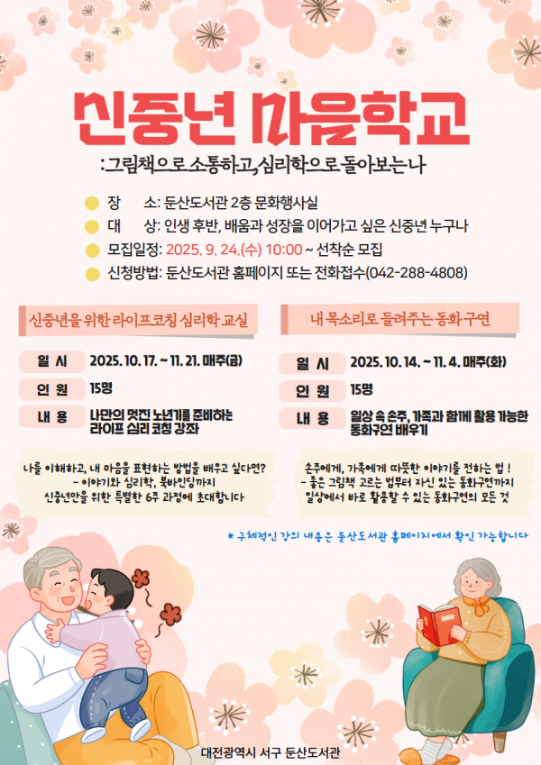 참여를 희망하는 신중년 주민은 이달 24일 오전 10시부터 둔산도서관 홈페이지 강좌 신청 메뉴 또는 전화로 신청하면 된다.