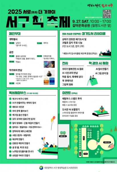 [PEDIEN] 대전 서구는 이달 27일 월평도서관 옆 갈마문화공원에서 ‘2025 서구 책 축제 더 가까이)’를 개최한다.