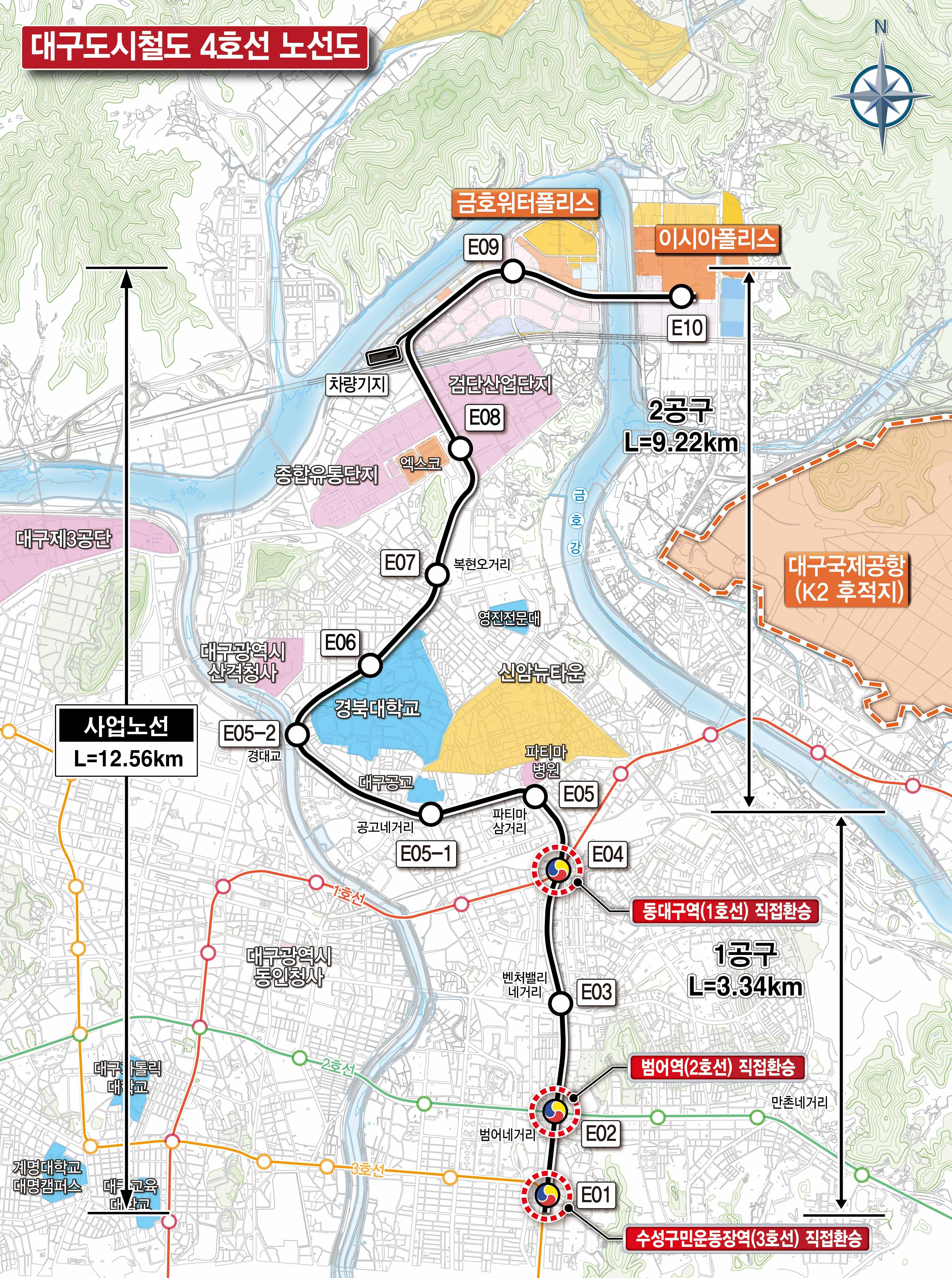 총사업비 8,821억 원이 투입되는 대구 4호선은 수성구민운동장역부터 동대구역, 경북대, 엑스코를 거쳐 이시아폴리스까지 총 12.56km를 연결한다. 이 구간에는 12개 정거장과 1개 차량기지가 건설된다.
