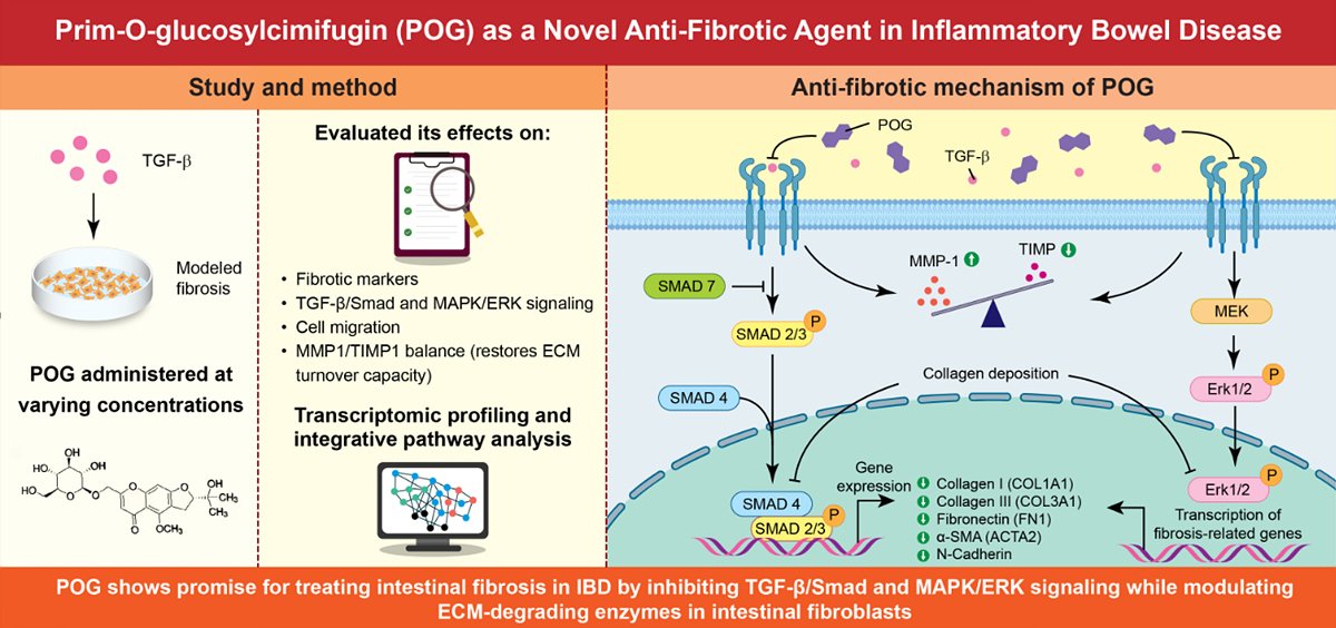연구팀이 주목한 성분은 천연물 유래 성분인 'Prim-O-glucosylcimifugin(POG)'이다. POG는 장 섬유화 진행을 억제하는 새로운 치료 전략으로, 과도한 섬유화 반응을 완화하는 분자적 기전을 보유하고 있는 것으로 나타났다.