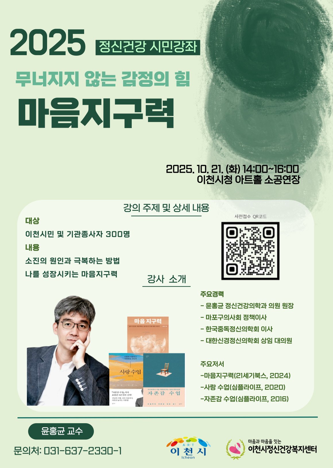 윤 전문의는 강연을 통해 현대인이 겪는 소진(Burnout)의 원인과 이를 극복하는 실질적인 방법을 제시할 예정이다. 스스로를 성장시키는 '마음 지구력'을 키우는 구체적인 정신건강 증진 방안을 시민들과 공유하며 공감대를 형성할 계획이다.