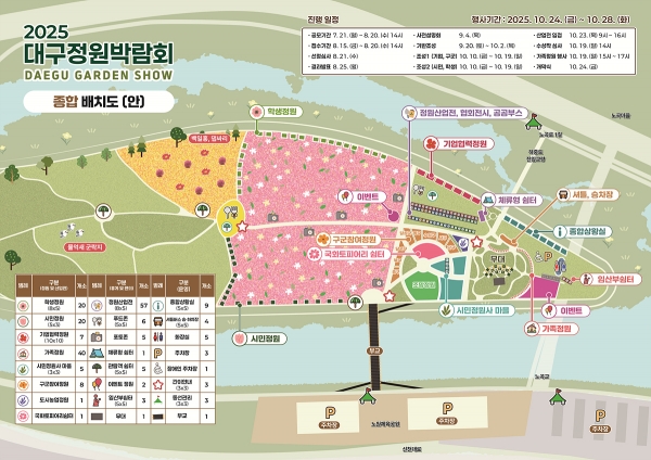[PEDIEN] 대구광역시는 일상 속 정원문화를 확산하고 도심 속 녹색 힐링공간을 선보이는 ‘2025 대구정원박람회’를 10월 24일부터 28일까지 5일간 금호강 하중도 일원에서 개최한다.