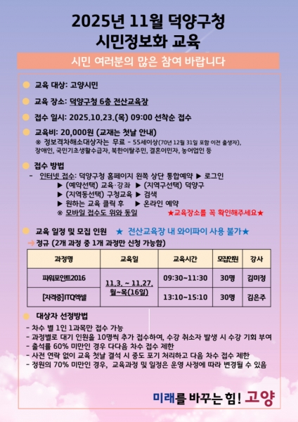 이번 교육은 11월 3일부터 27일까지 주 4일 덕양구청 6층 전산교육장에서 진행되며 △파워포인트 2016 △ITQ 엑셀 과정으로 구성돼 있다.