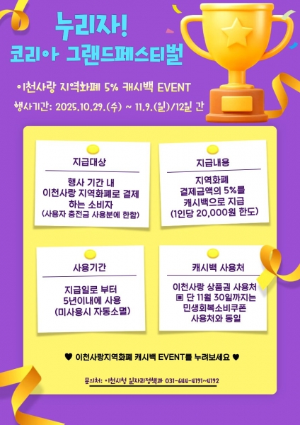 [PEDIEN] 이천시는 행정안전부 주관 ‘2025 코리아그랜드페스티벌’에 맞춰 지역화폐 이용을 촉진하고 지역 상권을 활성화하기 위한 ‘이천사랑 지역화폐 캐시백 5% 이벤트’를 추진한다고 밝혔다.