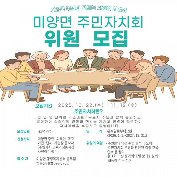 위원 선정은 공개추첨 방식으로 공정하게 진행될 예정이며 12월 18일 미양면 행정복지센터 4층 소회의실에서 실시할 예정이다.