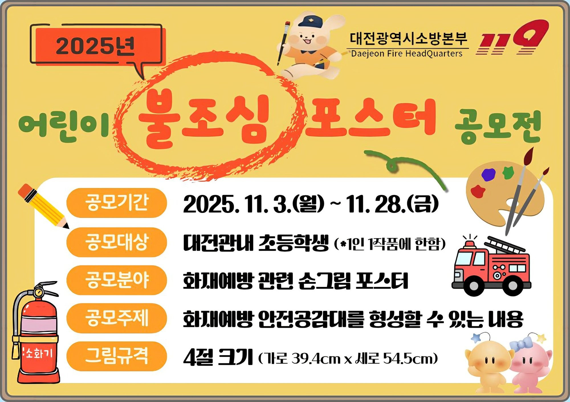 [PEDIEN] 대전소방본부가 2025년 어린이 불조심 포스터 공모전을 11월 3일부터 28일까지 진행한다.
