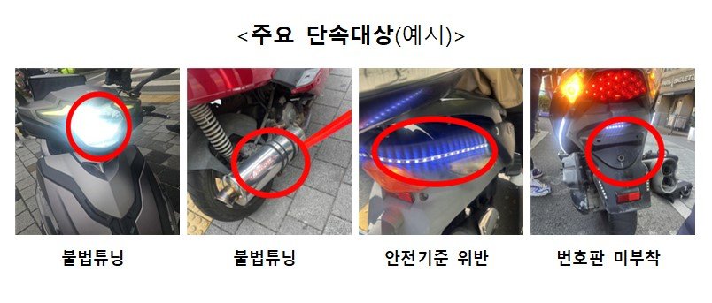 단속 대상은 전조등 불법 튜닝, 소음기 개조, 안전 기준 위반, 미사용 신고 운행, 번호판 미부착·훼손·가림 등 이륜차 관련 법규 위반 행위다.