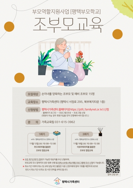 평택시가족센터 김성영 센터장은 “조부모는 가족의 돌봄과 세대 연결의 중심 역할을 하는 만큼 이번 교육이 더 건강하고 조화로운 가족 문화를 실천하는 계기가 되길 바라며 앞으로도 세대 간 소통과 가족 기능 강화를 위한 교육 및 프로그램을 지속적으로 확대해 나가겠다”고 밝혔다.