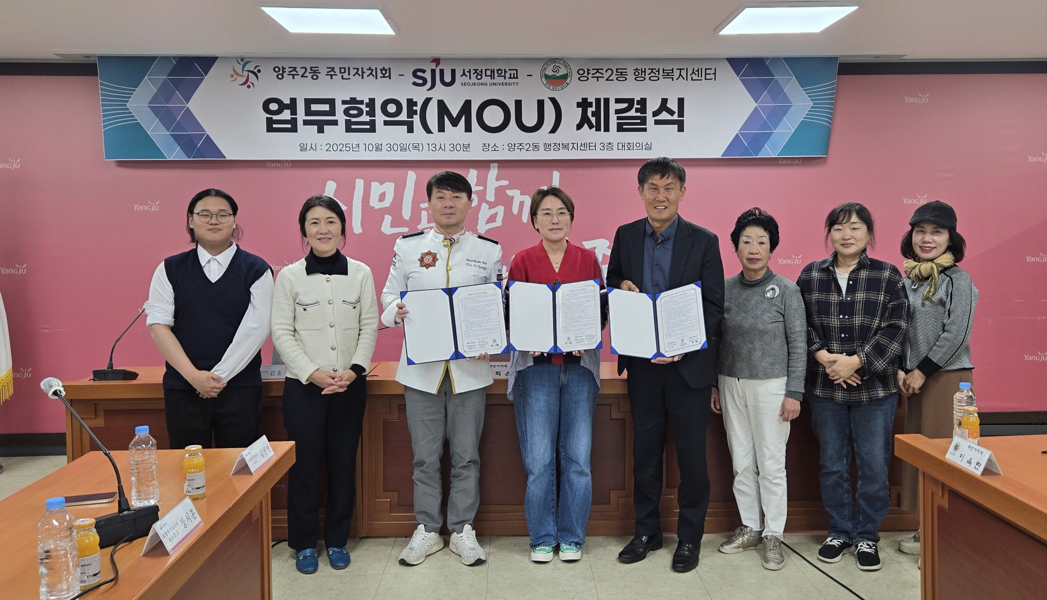 양주2동 주민자치회는 서정대학교와 지역 경쟁력 강화 및 상생 발전을 위한 업무협약(MOU)을 체결했다고 밝혔다. 이번 협약은 민·관·학 협력을 통해 지역 공동체 활성화와 주민 역량 강화를 목표로 한다.