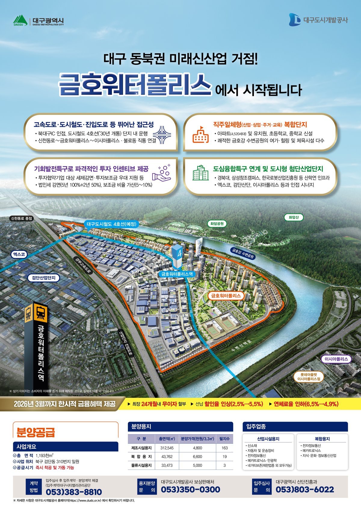 두 산업단지는 올해 12월 준공을 앞두고 있어 즉시 공장 착공과 가동이 가능하다. 금호강 수변공원과 인접해 정주 여건이 우수하고 고속도로와 도시철도 접근성이 뛰어나다.