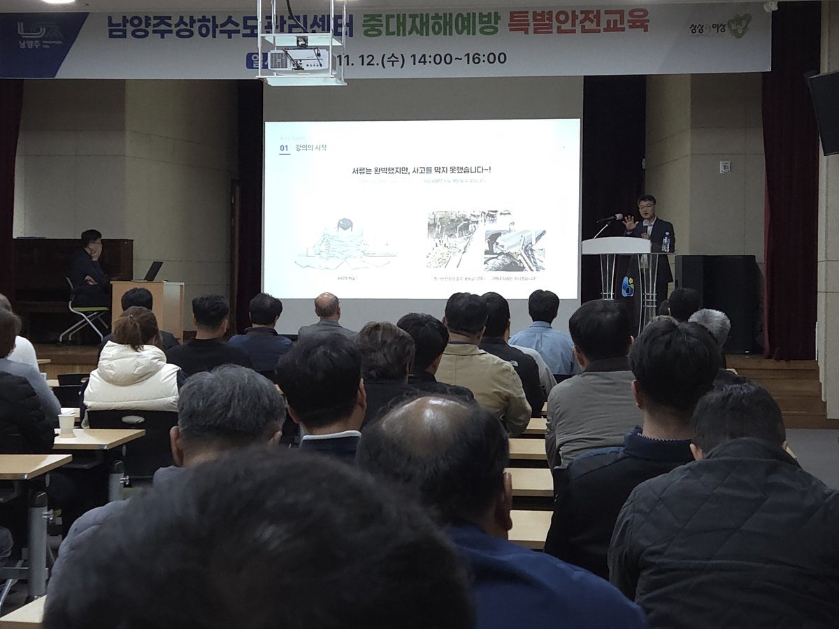 [PEDIEN] 남양주시 상하수도관리센터가 지난 12일 직원 및 협력업체 임직원 100여 명을 대상으로 중대재해예방 특별안전교육을 실시했다. 이번 교육은 별내주민자치센터에서 진행되었으며, 상하수도 시설 관련 산업재해 예방을 목표로 한다.