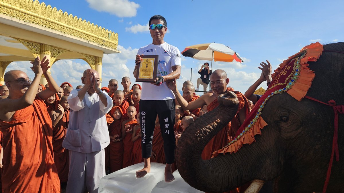 [PEDIEN] 양평군 홍보대사이자 '맨발의 사나이'로 알려진 조승환 씨가 미얀마 고마다 사원에서 '맨발로 얼음 위에 오래 서 있기' 5시간 30분 세계 신기록을 달성했다.