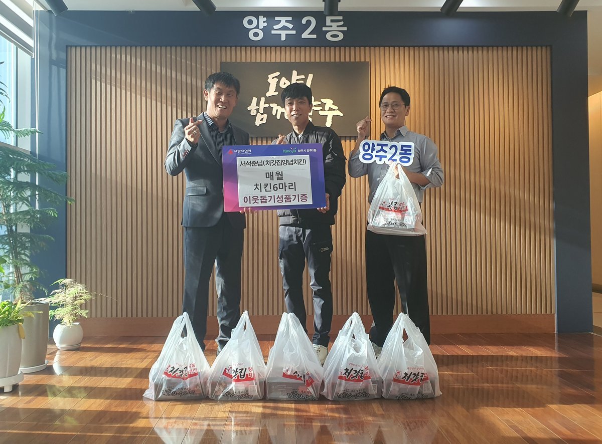 [PEDIEN] 양주2동이 처갓집양념치킨 경기북부·체인본부 서석준 차장으로부터 관내 어려운 이웃에게 전달될 치킨 6마리를 매월 기부받는다.