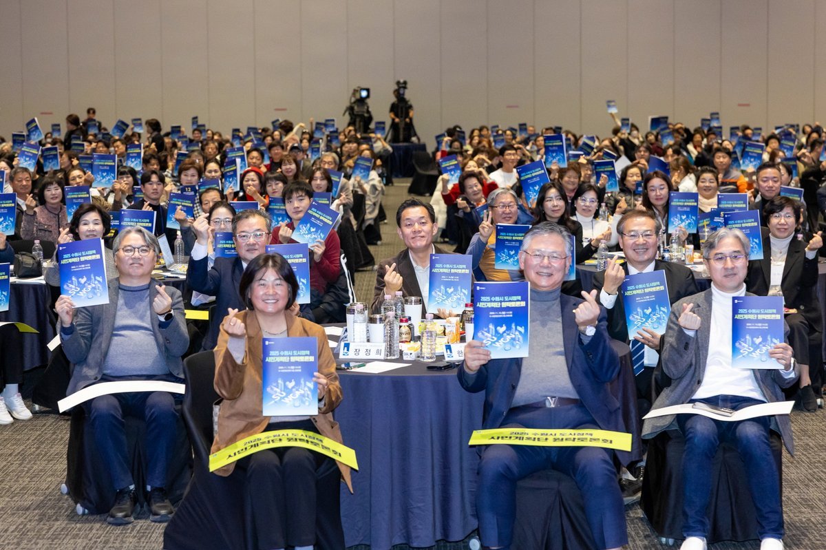 수원시는 16일 수원컨벤션센터 컨벤션홀에서 ‘S-FEZ 수원 경제자유구역 완성을 위한 전략은?’을 주제로 2025 수원시 도시정책 시민계획단 원탁토론회를 열고, 시민들의 의견을 들었다. 이날 토론회에는 이재준 수원시장과 도시정책시민계획단, 일반 시민, 청소년, 수원시의원 등 500여 명이 참석했다.