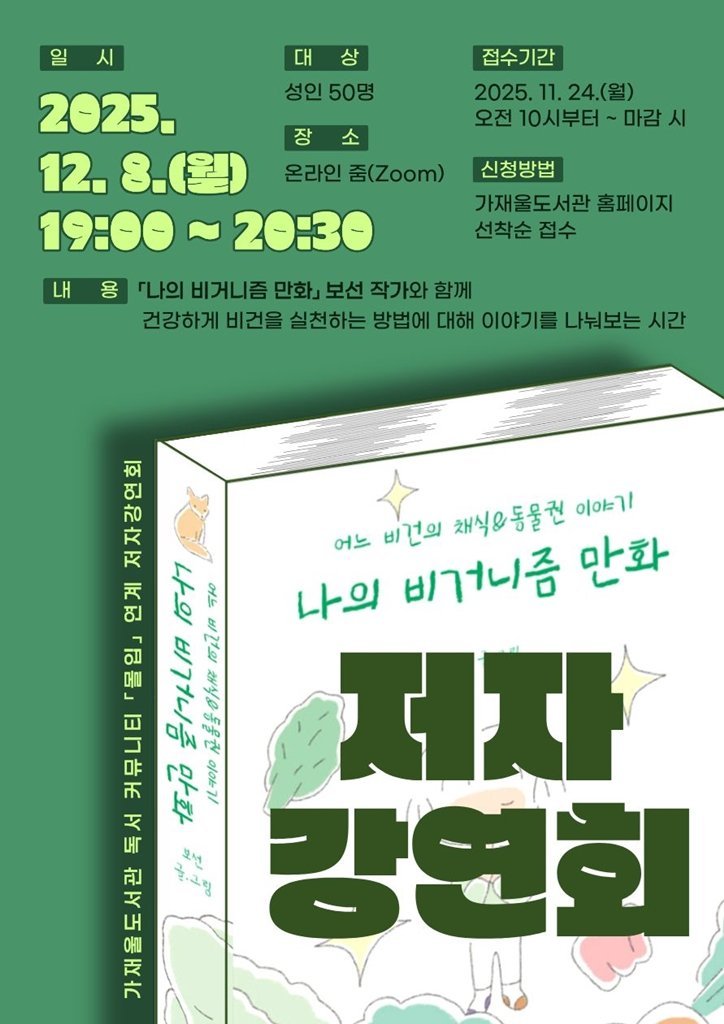 프로그램은 성인 50명을 대상으로 진행하며, 11월 24일 오전 10시부터 가재울도서관 누리집을 통해 신청할 수 있다. 접수는 선착순이다.