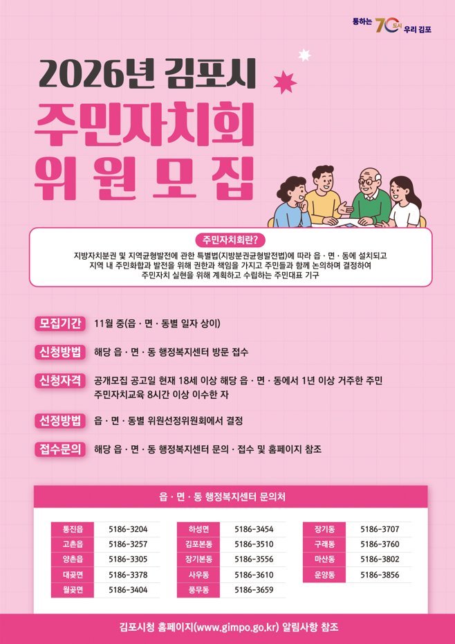 이번 모집은 주민자치회의 자율적 기반을 강화하고 자치역량을 높이기 위해 개정된 「김포시 주민자치회 및 주민자치센터 설치·운영에 관한 조례」에 근거해 추진된다. 김포시는 이번 조례 개정을 통해 주민자치회의 자율성과 전문성 강화를 통한 실질적 주민자치 실현의 기반을 마련했다.