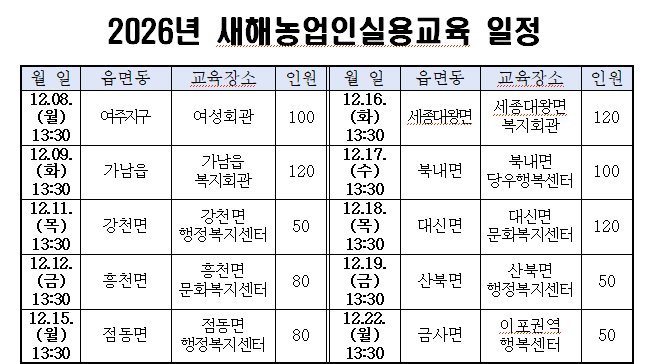 [PEDIEN] 여주시가 2026년 새해농업인실용교육을 2025년 12월 8일부터 22일까지 총 10회에 걸쳐 실시한다고 밝혔다.