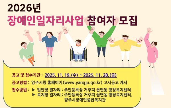 [PEDIEN] 양주시가 2026년 장애인 일자리 사업 참여자를 11월 28일까지 모집한다고 밝혔다.