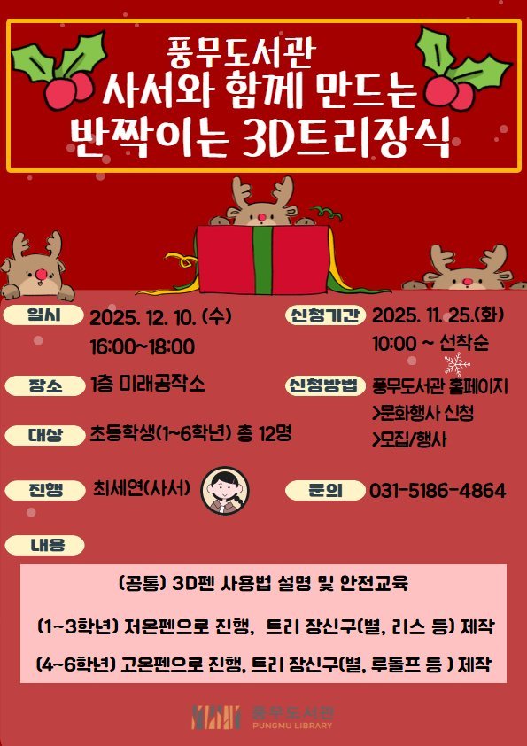 [PEDIEN] 김포시 풍무도서관이 초등학생을 대상으로 3D펜을 이용한 크리스마스 트리 장식 만들기 프로그램을 운영한다.