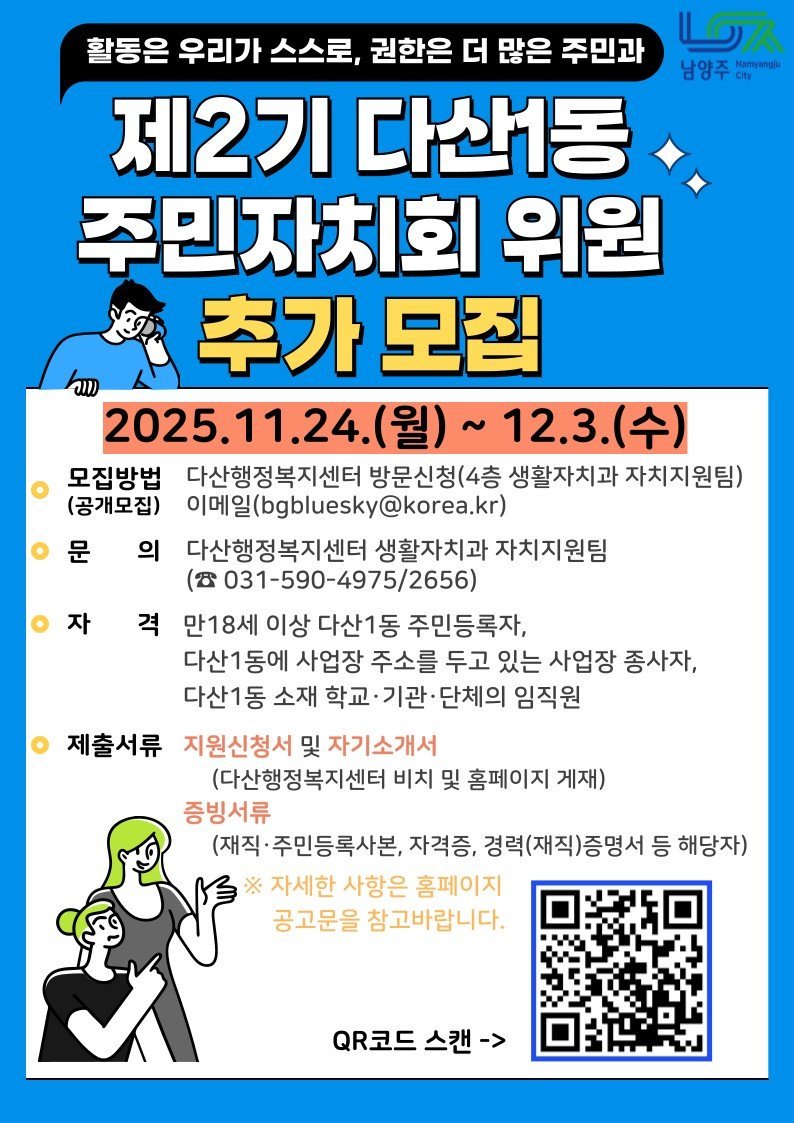 [PEDIEN] 남양주시 다산1동이 주민자치 활성화를 위해 제2기 주민자치회 위원을 추가 모집한다.