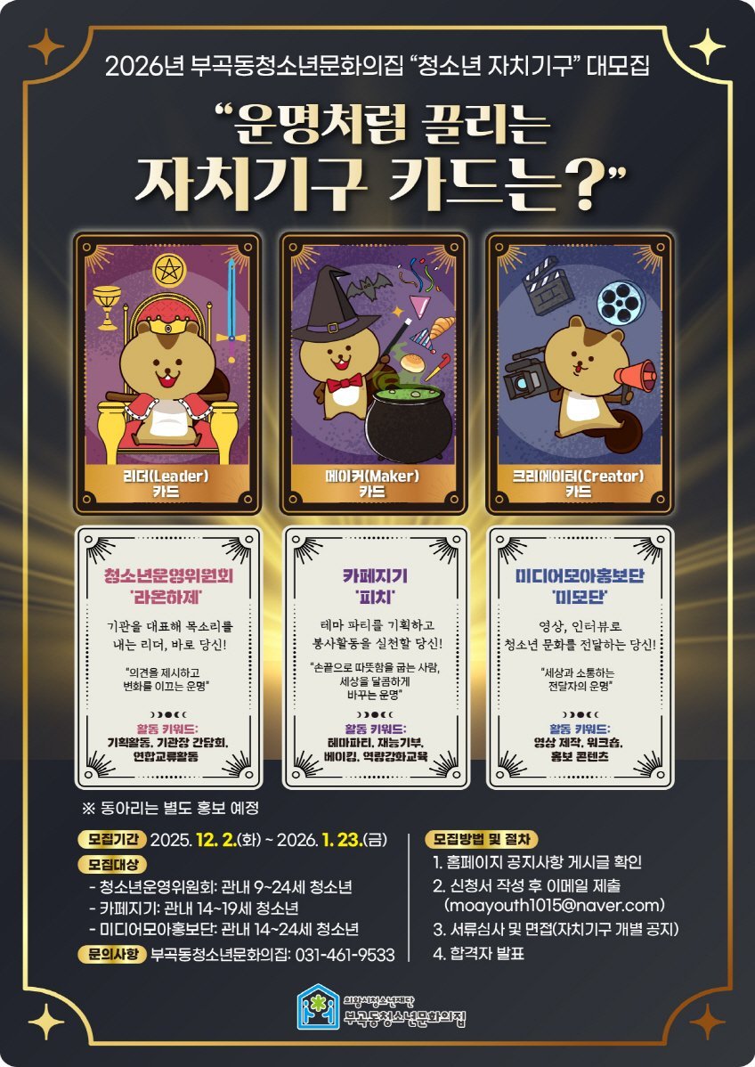 [PEDIEN] 의왕시 부곡동청소년문화의집이 2026년을 함께할 청소년 자치기구 참가자를 모집한다. 모집 기간은 12월 2일부터 2026년 1월 23일까지다.