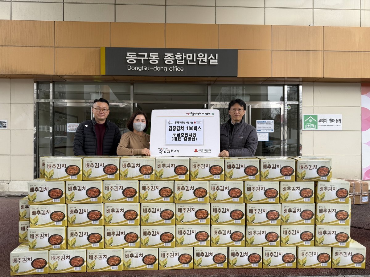 김건영 동구동장은 “㈜삼호썬샤인의 따뜻한 마음에 깊이 감사드리며, 기탁받은 김치는 관내 취약계층 100가구에 소중히 전달하겠다”라고 밝혔다.