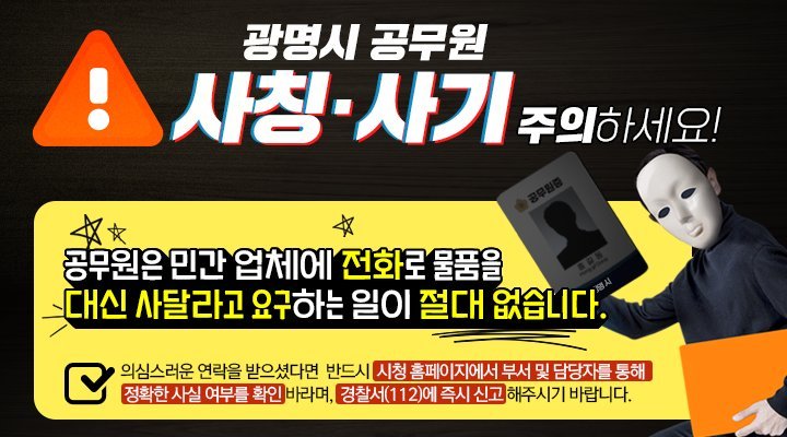 [PEDIEN] 광명시는 최근 공무원을 사칭한 사기 사례가 지속적으로 발생하자 지역 소상공인과 자영업자에 각별한 주의를 당부했다.