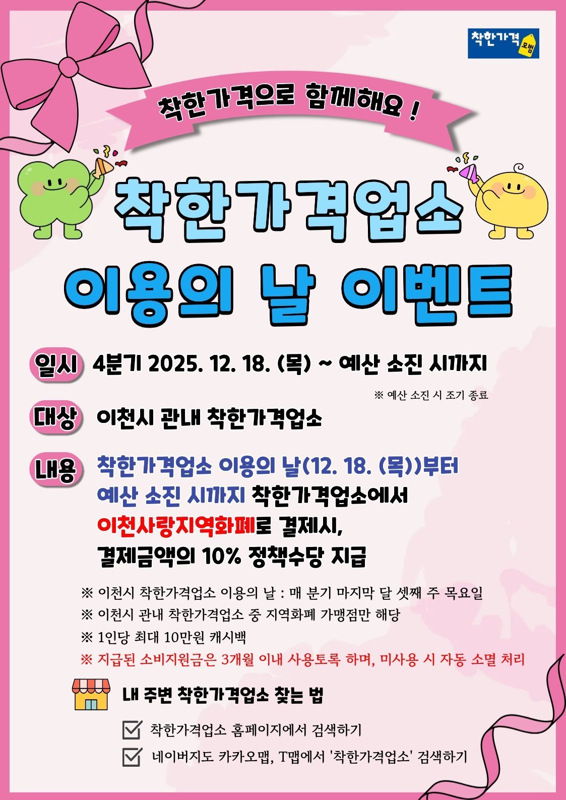 이번 이벤트는 12월 18일부터 예산 소진 시까지 이어진다. 이천사랑 지역화폐로 착한가격업소에서 결제하는 시민에게 결제액의 10%를 정책수당으로 지급하는 방식으로 진행된다.