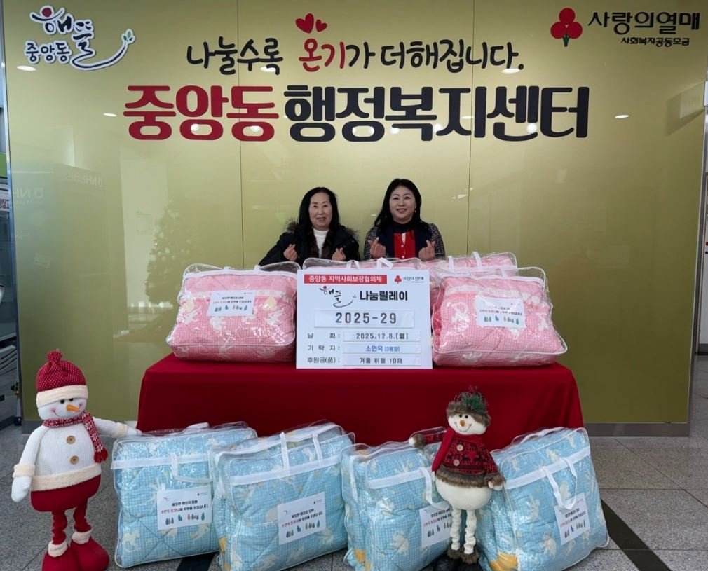 백경희 중앙동장은 “매년 이웃을 먼저 생각하며 따뜻한 나눔을 실천해주시는 소연옥 통장님께 깊이 감사드린다”며 “기탁된 이불은 독거노인 등 난방 취약 가정에 신속히 전달하여 겨울철 복지 보호에 만전을 기하겠다”고 말했다. 중앙동은 소연옥 통장의 따뜻한 마음이 담긴 이불을 통해, 추운 겨울에도 소외되는 이웃 없이 모두가 따뜻하게 지낼 수 있도록 최선을 다할 계획이다.