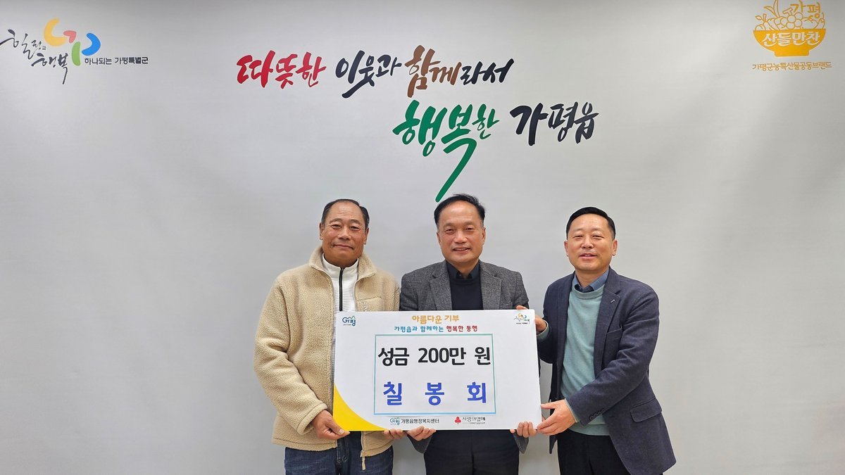[PEDIEN] 봉사단체 칠봉회가 가평읍에 따뜻한 마음을 전했다. 칠봉회는 이웃돕기 성금 200만원을 가평읍 행정복지센터에 기탁하며 지역사회에 훈훈함을 더했다.