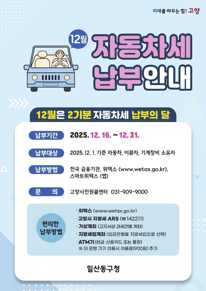[PEDIEN] 고양특례시 일산동구는 2025년 제2기분 자동차세 총 6만9572건, 약 115억 원을 부과하고, 지난 12일 고지서를 발송했다고 밝혔다.