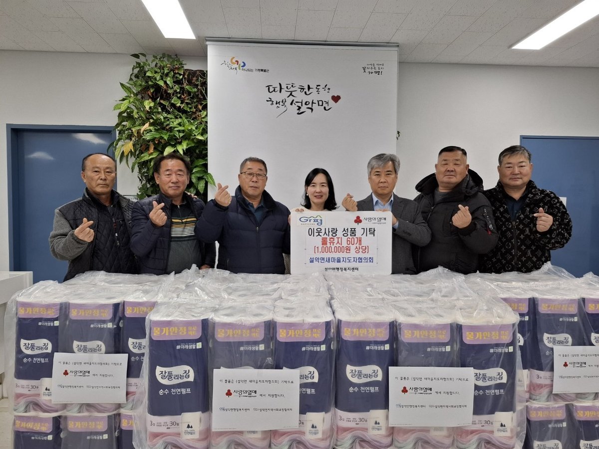 26명의 회원들로 구성된 설악면 새마을지도자협의회는 이웃사랑을 실천하고자 관내 저소득층을 위해 생필품인 롤휴지를 기탁했다.