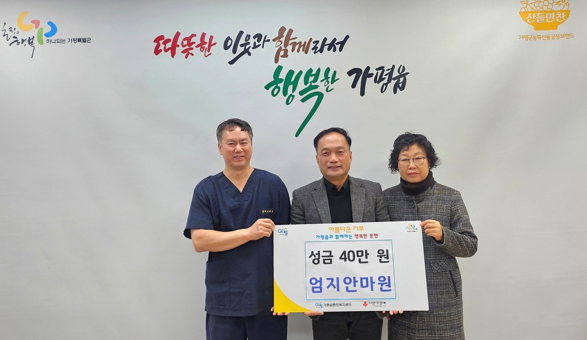 [PEDIEN] 가평군에 위치한 엄지안마원이 어려운 이웃을 돕기 위해 가평읍 행정복지센터에 성금 40만원을 기탁했다.