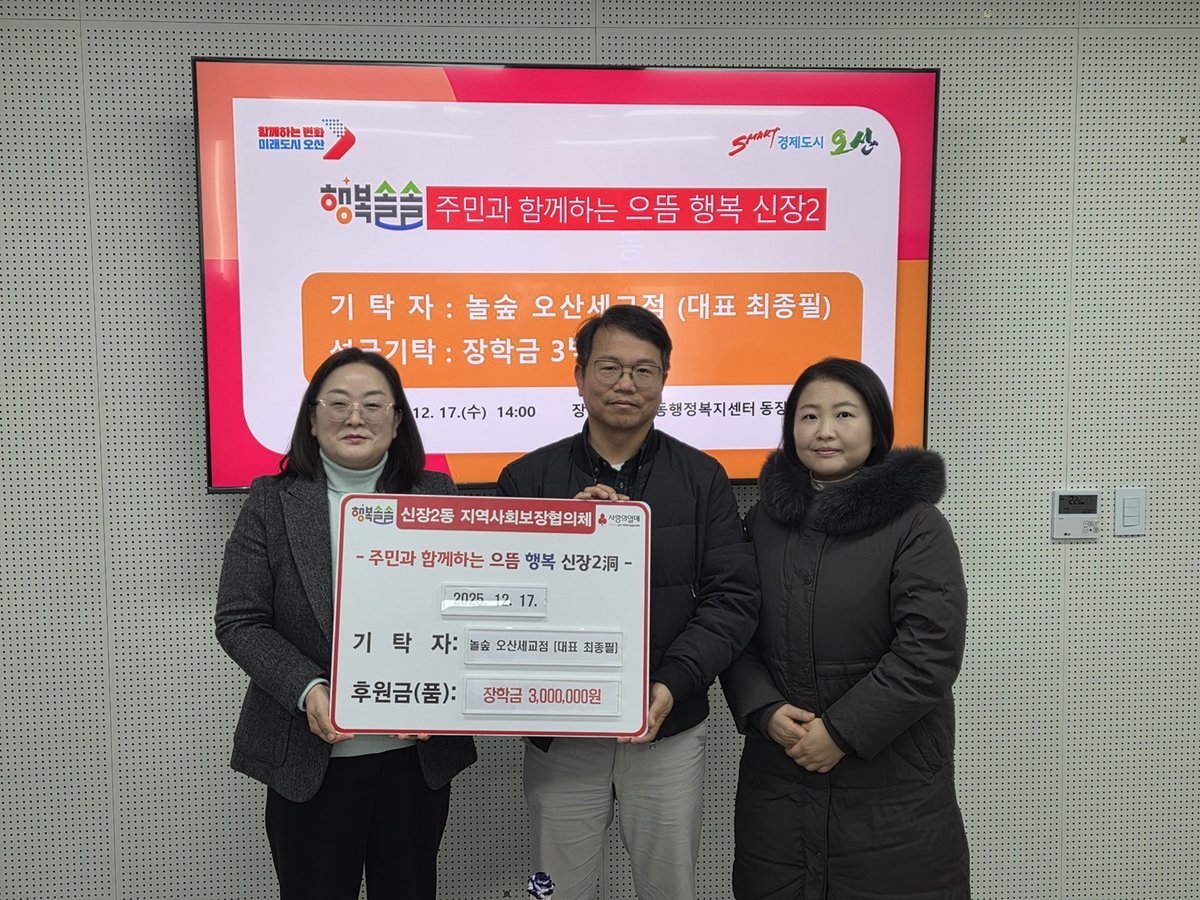 이은영 신장2동장은 “관내 아동들을 위해 소중한 장학금을 기탁해 준 놀숲 오산세교점에 깊이 감사드린다”며, “기탁된 장학금은 아이들이 더 큰 꿈을 꾸고 미래 인재로 성장하는 데 의미있게 사용될 것이다”라고 말했다.