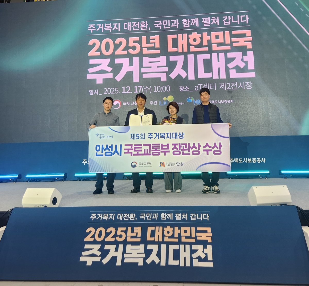 시 관계자는 ‘이번 수상은 시민들의 주거 안정을 위해 지속적으로 노력해 얻은 뜻 깊은 성과이며, 앞으로도 안성 시민들이 체감하고 공감할 수 있는 다양한 주거복지 사업을 지속해 나가겠다‘고 밝혔다.