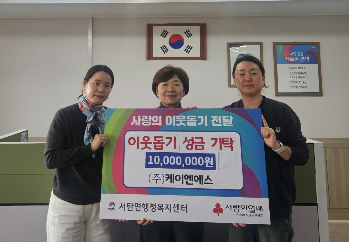 이동복 서탄면장은 “올해도 변함없이 기부해 주시는 케이엔에스에 깊이 감사드린다”며 “기부금은 꼭 필요한 곳에 투명하고 의미있게 사용해 따뜻한 서탄면을 만드는 데 최선을 다하겠다”고 말했다.